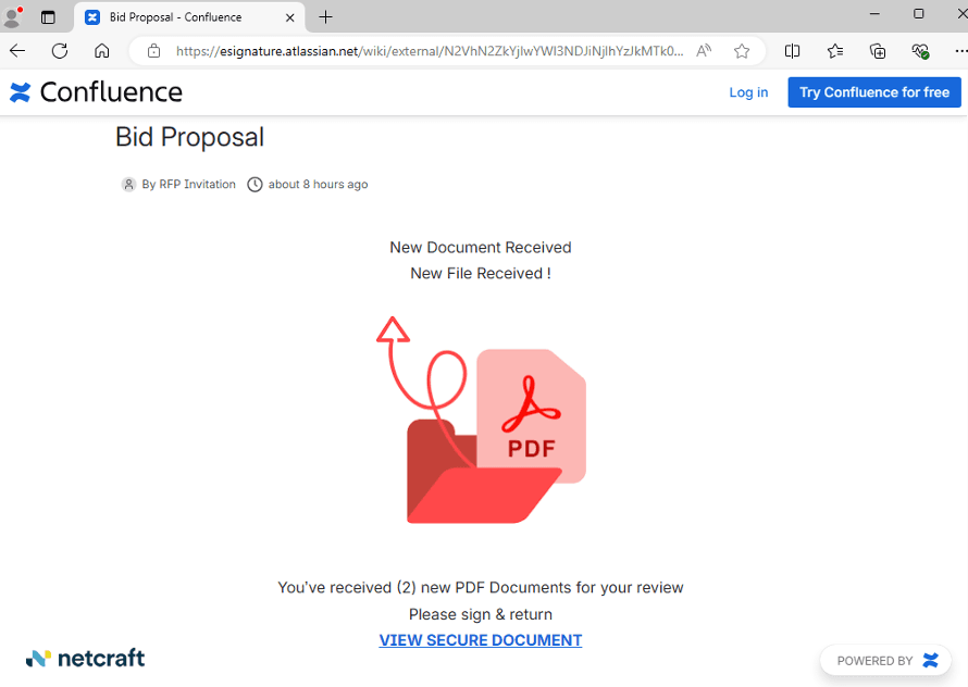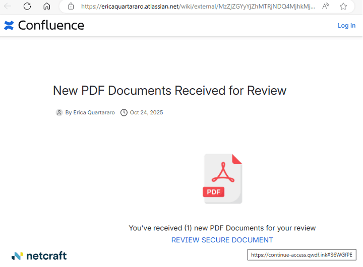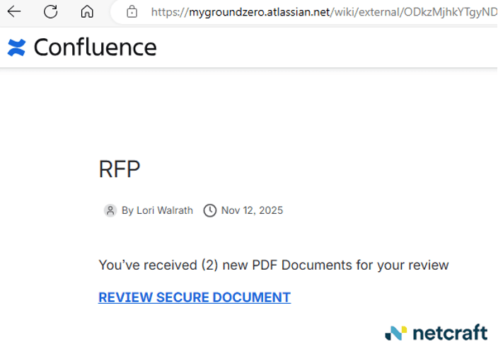 Netcraft has observed several variations of this attack involving malicious Confluence wiki pages leading to phishing sites. Some have had extremely basic pages with just the text "review secure document" linking to the phishing site.
