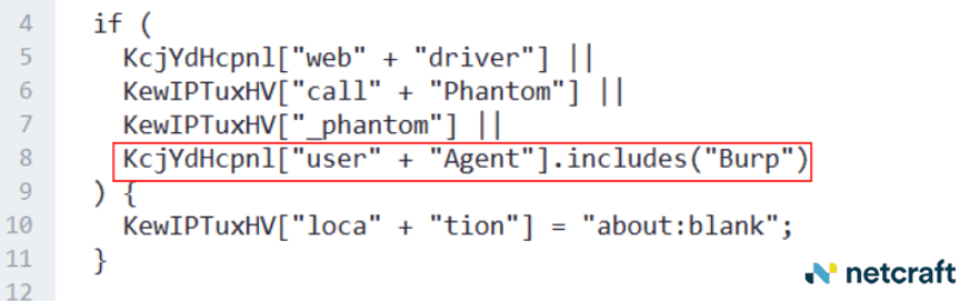 The pages contain several features designed to thwart automated analysis, such as a filter that blocks visits by users of the Burp Suite web analysis tool, directing them to an empty page.