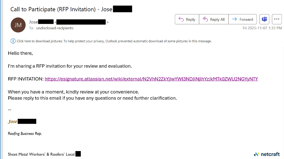 Targets of this attack received a message like the one below, the body of which invites them to follow a link to a website in order to view an RFP (request for proposal).