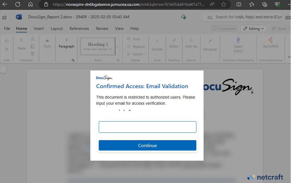 But visitors eventually landed on a page that presented a login dialog box over the top of a blurred image of a Word document and a prompt to enter a valid Microsoft 365 account credential.