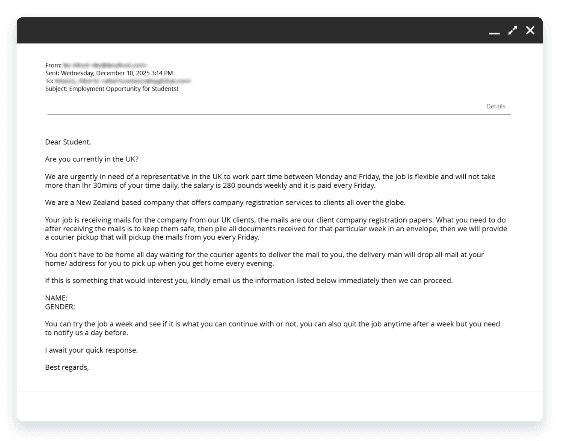 However, money muling can take many forms; students are not only targeted via social media, and neither are they always asked for control of their bank accounts.Often, money mule recruitment can be disguised as a job offer, and there have been cases of students receiving unsolicited emails to their university email address regarding part-time work that involves transferring physical documents. Below is one such example that ended up in the inbox of a Netcraft staff member while they were a student – note how the fraudster says that students can receive post to an address that is then picked up by a courier: