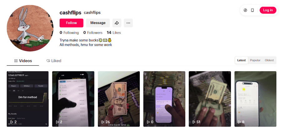 Figure 1. A generic money mule recruitment profile on TikTok that advertises ‘all methods.’
