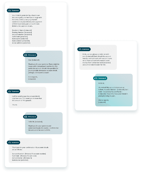 In a particularly interesting exchange, one fraudster ended up in separate conversations with two of our personas. When Persona A requested a UK account from the fraudster (which the fraudster did not have) in which to supposedly deposit money, the fraudster asked Persona B to provide their bank details, disguising it as a favour for a friend, before passing on said details back to Persona A. Not only was Persona B getting scammed, but they were being tricked into becoming involved in money laundering in the process.