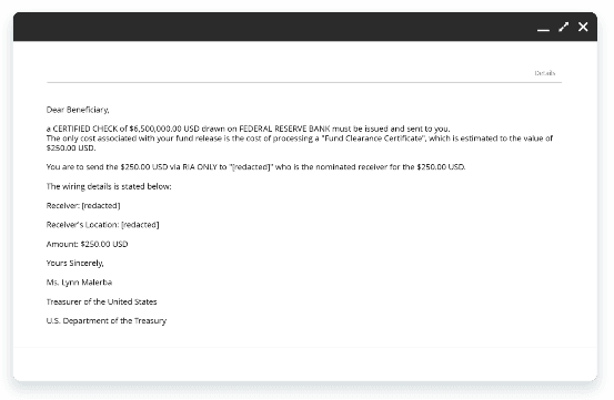 Unsurprisingly, it's unlikely that the documents referred to in the above email are really ‘company registration papers.’ In fact, similar conversations between criminals and our Netcraft Scam Intelligence personas would suggest that ‘documents’ like this could be cash, transfer slips, or other means of payment. In one conversation with a fraudster who was impersonating the Federal Reserve’s Jerome Powell, one of our personas was asked to send cash to an address in the UK, possibly belonging to a mule: