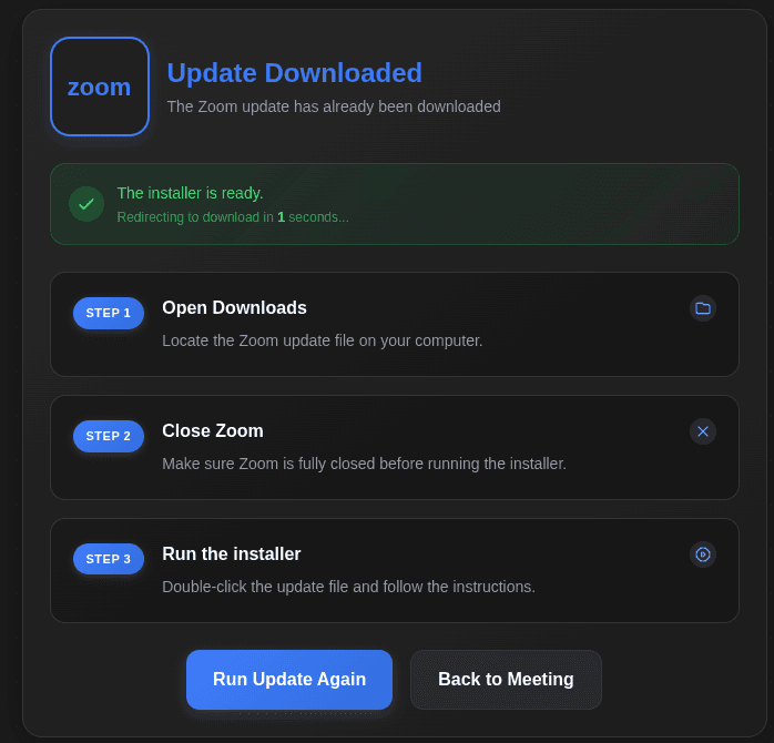 Educate users that legitimate Zoom and Google Meet sessions do not require mid-call executable downloads, and that automatic “update” prompts within browser-based meetings should be treated as suspicious.