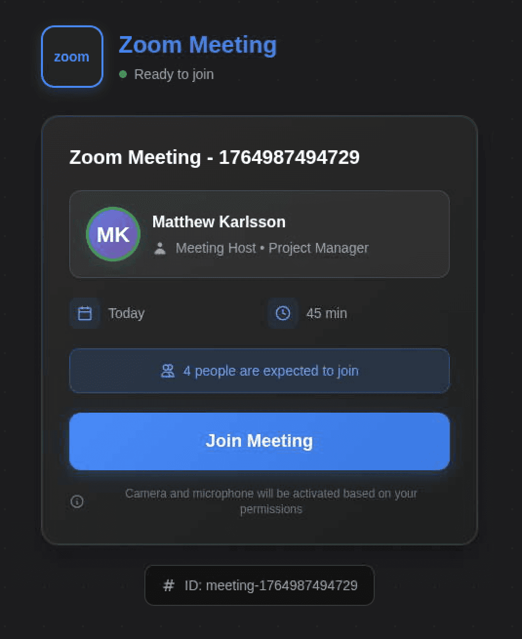 Visitors to the identified domains are presented with a fake Zoom or Google Meet interface showing an active meeting, typically featuring “Matthew Karlsson” as Project Manager. The page indicates that additional participants are expected to join.