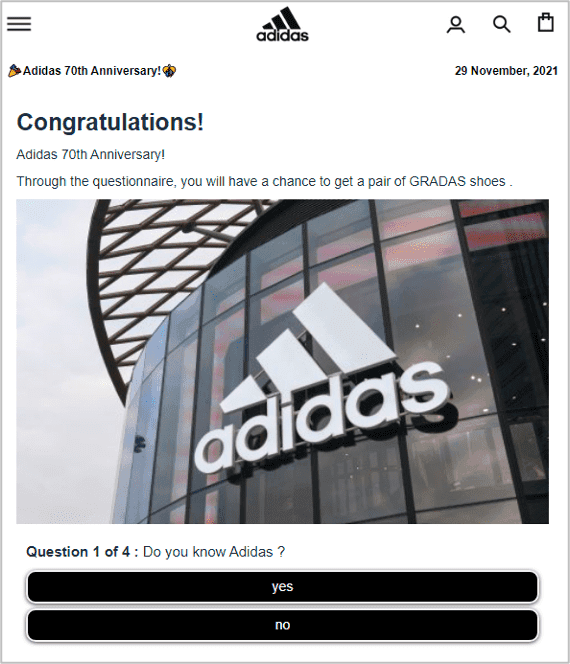 Survey scams are online forms that trick users into thinking they are being marketed to by a legitimate company or brand. The scams often look professionally designed and will impersonate established organizations using the target brands logos, fonts, colors and other design elements. Once again, these scams are used to lure victims into providing personal information (which the criminal will use to commit further crimes) in exchange for the chance to win a non-existent prize.